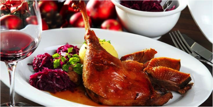 Portion Gänsekeule oder Gänsebrust mit Klößen, Rotkohl und Maronen